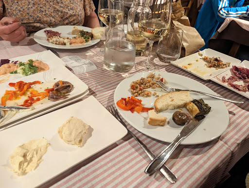 Typical trattoria with a nice view of the gulf, up a very narrow, steep street. Food-wise, I would Not recommend the stuffed mussels or the raviolini al sugo. The mussels stuffing was tasteless and crumbly. Simply put, they should have been made with the moist crumb inside the bread (mollica), not dry bread crumbs (pangrattato). There was hardly a hint of anything else that should be in them, namely mortadella, parmigiano cheese and parsley as a minimum. The ravioli were commercially made with overly thick dough, and only a dot of ominous looking dry green stuffing, without even the scent of the braised meat typical of the real home-made ravioli I grew up eating in La Spezia. The ravioli in the pictures from other diners were Not the ones we received. Portion size was also disappointing, with 8 SMALL mussels per person. The French fries were clearly frozen, pale, and quite limp. Barely edible. On the flip side, the entrees ordered by the rest of our group were above average, including the vitel tonne (veal in tuna sauce), and the seafood fettuccine. Dessert was commercially made and just doctored up. Nothing we tasted felt home-made. The house white sparkling wine was very good. Service was excellent given how busy the place was. Our waitress was attentive and readily took care of our requests for cheese (served in small individual packs) and salt. Beware: there was No water, No toilet paper and No towels in the bathroom. Bring your own. Overall it was an ok experience, not one I'd care to repeat. There are many other trattorias in La Spezia. My suggestion would be to go enjoy the view with coffee and...