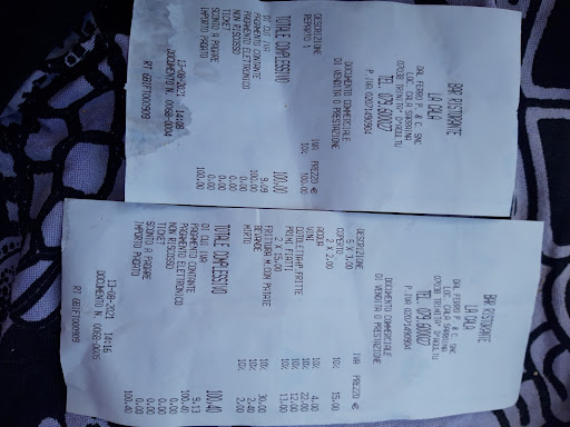 La ciliegina sulla torta, il conto. Sempre a voce, sulla fiducia e nessuna discrezione. (Credo che tutta la sala alla fine sapesse quanto avessimo speso, ovvero un fracasso). Alla richiesta della ricevuta di dettaglio, si presenta ancora una volta lui con il cartone del retro taccuino comanda ed un riepilogo scritto a penna, un tornaconto. L’unica cosa di cui ho voglia è andare via e chiamare il 117 sulla strada del rientro.