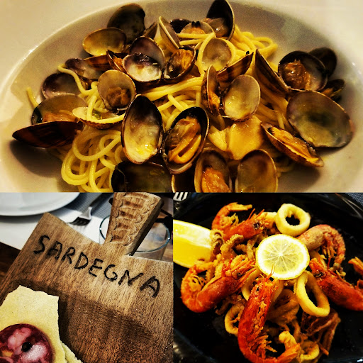 Dinner #1: The meal started with a complimentary ANTIPASTI MISTO SALUMI E FORMAGGI (platter of local cured meats, cheeses and bread). All the fish and seafood dishes were fresh and cooked to perfection. SPAGHETTI ALLE VONGOLE (spaghetti w/ sweet little clams); FRITTO MISTO CALAMARI E GAMBERI (calamari & prawns deep fried in light batter); PESCE ALLE GRIGLIA (grilled catch of the day). Meal ended with a delicious Sardinian dolce called SEADAS, a crisp airy pastry filled with sweet soft cheese and drizzled with golden Sardinian honey. A perfect end to the meal and worth ordering even if you're so full you swear you couldn't eat another bite. You can. I promise.