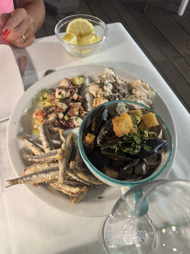 Read moreSiamo stati io e la mia compagna spinti dalla curiosità. Accoglienza fredda, di per sé non sarebbe un problema ma, visti i gestori dell'isola molto cordiali, è lecito aspettarsi lo stesso leit motif da tutti ma, ripeto, ognuno gestisce come vuole. Abbiamo ordinato un antipasto della casa per 2 (€26) e devo dire che il polpo con patate buono ( anche se sul menù c era l asterisco) alici fritte buone, alici marinate buone, soute cozze e vongole nella media ma pesce presumibilmente fresco. Pacchero col granchio bocciato, sia per una questione economica (20€ 8 paccheri contati) sia per una questione di sapore. Nota positiva la presenza di chela e mezzo busto che, con gli appositi strumenti forniti mi ha permesso di mangiucchiare un po' di crostaceo. Totani al sugo passabili, vino rosé del posto 1 bott 15€ buona. Conto eccessivo, 88€ FRATELLO 15 PACCHERI IN PIU POTEVI BUTTARCELI, CI VAI SOPRA UGUALE. Critica personale il carrello del pesce fresco che, passava solo a determinati tavoli ( sa molto di acchiappa turisti e soprattutto crea tavoli di serie A e tavoli di serie B). Che poi l avessero pushato si sarebbe preso anche noi un pescetto fresco da mangiare. Con questa spesa vado da altre parti dove, se mi cacano nel piatto almeno mangio bene. Che poi offrimelo un caffè o un mezzo amaro se ci lasciò 90€...
