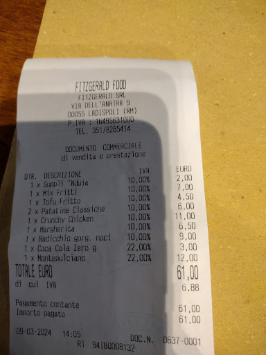 Read moreSome of the best takeaway food I have ever had. We stayed in Ladispoli 3 nights and we ordered off Fitz two of those nights. We had chips. Nuggets. Mozzarella sticks and double cheeseburgers. Highly recommend. We had trouble in the website ordering with our location. I messaged then on What’s soo and they replied within seconds with the exact...