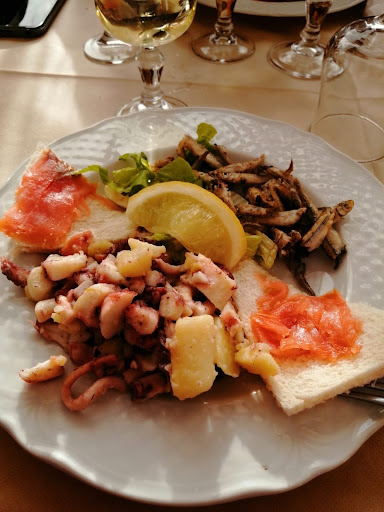 Read moreLocale semplice fronte mare su balcone verandato. Primi della tradizione (amatriciana e carbonara) ben conditi, saporita l’abbondante porzione di spaghetti alle vongole, nella norma il filetto di spigola in crosta di patate e gamberoni. Per il menu fisso di mare, non generoso l’antipastino e poco saporite le grandi cozze del sauté su pane ammollato. Senza lode né infamia il risotto alla crema di scampi mentre ottimi e perfettamente al dente i paccheri allo scoglio. Alcune fritture di calamari e gamberi più croccanti di altre. Il vino della casa, troppo leggero, lo abbiamo fatto sostituire, pagando un sovrapprezzo, con un fresco Pecorino. Il proprietario, vedendoci non troppo entusiasti per alcune portate, ci ha fatto ripreparare i sauté con pane bruschettato e omaggiato di un assaggino di gnocchetti al tartufo e contorno di patatine fritte che sono risultati squisiti e ci hanno fatto rivalutare qualche scontentezza. Personale gentile ma un po’ alle prime armi. Nota di merito agli amari al carciofo e alla Luna Nera...