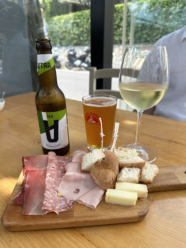 The menu rotates daily and is very short, primarily meat oriented dishes (no seafood offered the day we visited) with small plates such as roast chicken, pork ribs, green salad, burrata and tomato. The best part about this place (for Americans) is that they provided a FREE cheese and charcuterie board when we ordered two alcoholic beverages (we got one glass of wine and one beer)! They even brought me more cheese and bread when I ordered a second glass of wine. The Chardonnay was local and excellent, perfectly chilled. The cheese was fresh and the bread to cheese/meat ratio was good. My husband loved his roast chicken and green salad, all of it was really fresh and well seasoned. We would definitely...