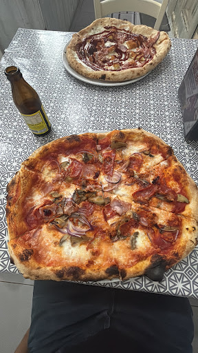 La pizza è veramente molto gustosa, non salata, con ingredienti di qualità e ben equilibrati. Ad esempio, la pizza "...frantoio" ha un profumo di olio e un sapore tipico di un forno a legna di "paese" o casalingo. Abbiamo assaggiato sia la pizza tonda che quella alla pala (prendendo alcuni pezzi al banco), preferendo la seconda in quanto leggermente più spessa e quindi con un sapore più intenso di forno a legna. In generale, cmq l'impasto è morbido e soffice, ma non molto "sfogliato' (manca inoltre forse un po' di croccantezza tipica di pizze simili alla pala). Anche i fritti sono molto saporiti e asciutti. Si può fare asporto o mangiare all'aperto in un contesto assolutamente informale e spartano, coerente cmq al tipo di servizio. Nel complesso, vien voglia di ritornare a provare i tanti altri gusti delle...