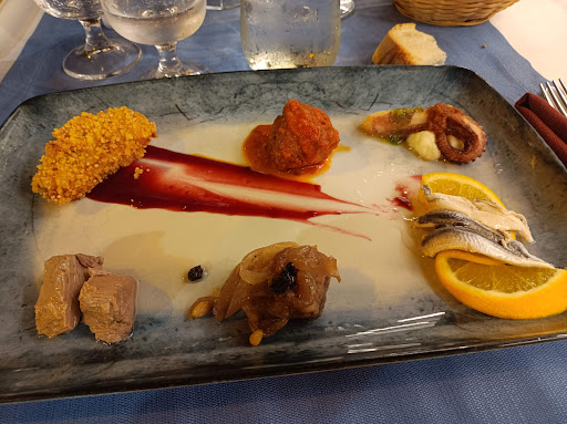 Central restaurant and fresh fish shop, service was prompt and kind, however we asked three times for no parsley and the main course arrived with parsley! We booked a fish cous cous which was tasty but we would have preferred it to include more fish variety - there was only vegetables and a grouper steak. For 25€ we'd expected a richer dish. My sister's linguine with pistacchio and red shrimp were actually poor, only four (literally) shrimps in it and pistacchio was simply sprinkled on top of the pasta. Very good wine though, sparkling white, I'm not 100% sure but it may have been "Grillo" wine. To sum up, good but not outstanding, and...