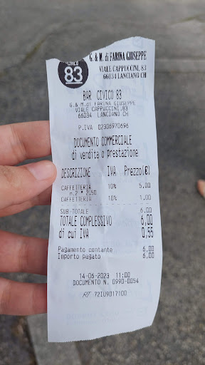 Civico 83 ha l'aria di un bar di passaggio, ma poi quando entri l'atmosfera è famigliare e il personale è gentile, ti fa sentire subito a tuo agio e non ti mette affatto fretta, nemmeno se ci sono molti clienti da servire. In due abbiamo acquistato dei tramezzini e una bottiglietta d'acqua naturale spendendo 6 euro. Economico e buono. I tramezzini, preparati con la tipica focaccia lancianese morbida e saporita, credo fossero riempiti dalla signora del bar, perché erano avvolti in della semplice pellicola alimentare e tutti i tramezzini esposti hanno un'etichetta alimentare scritta a penna che ne indica il ripieno. Abbiamo scelto tramezzini con insalata, prosciutto e formaggio, il gusto era delicato, l'insalata fresca e la conservazione era adeguata, infatti non si sentivano sapori "intrusi" come può capitare quando ci sono tanti prodotti diversi nel banco. Il locale ha delle ampie vetrate che ampliano lo spazio visivo, ma è piuttosto stretto, ecco perché è consigliato solo per una breve sosta. Dai finestroni, protetti da grandi tende esterne che filtrano la luce più intensa del mattino, è possibile ammirare uno spaccato di Viale Cappuccini, il secondo Centro di Lanciano, dove ruba la scena una grande Chiesa. A due passi si trova un supermercato, un ristorante e una banca, e ci sono anche molte altre attività tutto intorno. Tutto sommato ci tornerei, anche se non per andare in bagno... consiglio un impegno maggiore nella pulizia del wc e dei pulsanti in bagno (unico per tutti), oltre alla pulizia delle maniglie. L'erogatore del sapone automatico era vuoto, quindi rimpiazzato da un comune erogatore manuale,...