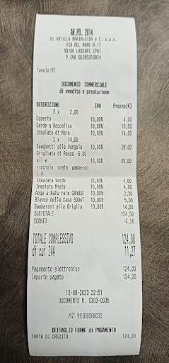 Read moreVolevamo mangiare pesce per il compleanno di mia mamma che era venuta in vacanza da me. Passando di lì le è piaciuto il posto verde e con luci ecc. e abbiamo prenotato. Arrivate lì la sera del 13 agosto ci davano un posto scomodo e brutto da vedere perché nel loro passaggio con i piatti. Dopo avere chiesto di spostarci, hanno finalmente cambiato il tavolo nel giardino dove era bello starci. Riguardo al cibo, il pesce non era né fresco e né preparato bene. Mancavano anche un sacco di attenzioni base che i ristoratori devono avere, come il piattino per i gusci delle vongole, la salviettina imbevuta, il limone ecc.. Abbiamo preso 2 antipasti che erano giusto normali, niente di particolarmente gustoso, i 2 primi (spaghetti alle vongole) avevano 3 vongole contate e la pasta non era uno spaghetto ma enormemente grosso e asciutto. Lo abbiamo lasciato lì. E poi una grigliata di pesce che è risultata 39€ più i 4 gamberi piccoli e brutti €14. Normalmente fanno già parte della grigliata mentre qua erano separati come prezzo ma messi nello stesso piatto. E non avevamo nemmeno tolto l'intestino nero con gli scarti. Poi due insalate che facevano pena, 4€ cadauna. Una bottiglia di vino scarso. Per un totale di ben €124 per passare una serata dove devi chiedere quello che già devono fare e mangiare cibo fatto male. Era l'occasione di mangiare pesce al mare visto che si parla tanto della gustosa e accogliente Sicilia. Purtroppo devono ancora imparare tanto. Noi non impoveriamo con €124 in meno ma di certo loro non arricchiranno prendendo in giro le persone. E ovviamente tante persone sapranno da pare nostra come sta la realtà riguardo la loro struttura. La maggior parte delle persone mangiavano pizze. Forse sono più bravi nelle pizze.