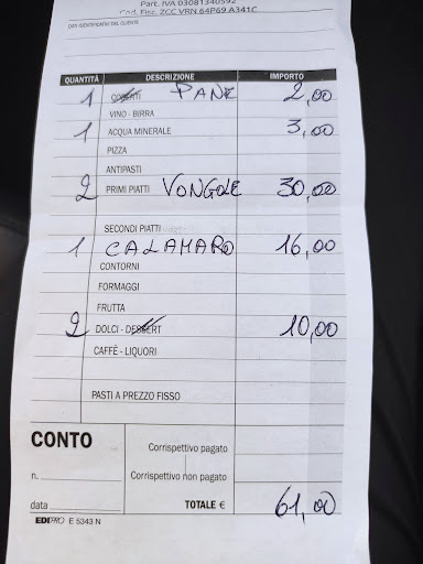 Read moreNon mi sento di mettere piu di 3stelle per i seguenti motivi: -Gli spaghetti con le vongole erano piu che al dente e le vongole erano lupini per (15€mi sembra eccessivo) -il tiramisù era congelato Invece nota positiva per : -ll calamaro fritto freschissimo e con una panatura croccantissima -croccante al pistacchio Ottimo (anche lui congelato ma molto meno rispetto...