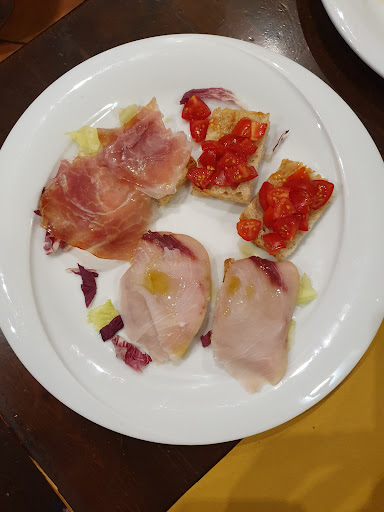 Cibo: Giustamente famoso per i suoi crostini, abbiamo provato quello lardo e pecorino e quello stracciatella e alici: ottimi, un inizio ricco di gusto. A seguire, una porzione (in due) di vitello tonnato: carne ben cotta, morbida e piacevole, forse leggermente poco sapida (avrei gradito un tocco in più con l'aggiunta di capperi), ma comunque finita fino all’ultima scarpetta. Come piatto principale abbiamo scelto il fuori menù del giorno: stracotto di guancia di manzo con purè di patate. La carne era cucinata alla perfezione, tenerissima e scioglievole; la salsa intensa, con note speziate di cannella e bacche di ginepro, anche qui a mio gusto leggermente sotto di sale. Il purè, rustico e fatto al momento, era il giusto accompagnamento. Per concludere, i biscotti secchi tipici del territorio: semplici ma sempre rassicuranti, un finale che sa di tradizione.