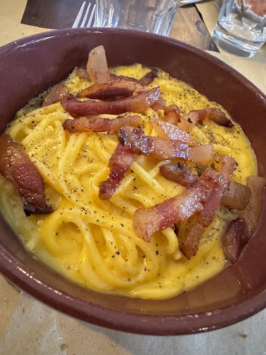 Locale accogliente, bella atmosfera. Personale nel complesso simpatico, attento e disponibile. Ho avuto modo di mangiare qui diverse volte nell'ultimo periodo e una delle poche pecche è rappresentata dai tempi e dallo stesso personale che in situazioni di maggior affollamento fatica un po. Passando al cibo, i fritti, i taglieri e il tris di bruschette meritano tantissimo, soprattutto il "Fritto misto di Dalì", ottimo sia per quantità che per sapori. Passando alla carne, buona ma senza infamia e senza lode, con un prezzo forse un po sopra rispetto a quanto ci si aspetterebbe guardando la portata. Ottime le verdure grigliate come contorno. Per chi invece ha scelto la "Pinza" l'ha giudicata buona sia per impasto che per ingredienti usati, saporiti e in quantità. Passando ai primi, purtroppo, nelle diverse esperienze la qualità è stata altalenante (sulla quantità invece non si può discutere). Da esperienza ottime ad altre da dimenticare. La prima volta i primi, sia la gricia che la carbonara erano eccessivamente salate. Il difetto è stato però corretto anche a seguito di altre recensioni sulla stessa linea che ho avuto modo di leggere, e questo secondo me è sinonimo di attenzione verso il cliente. La seconda volta invece nulla da eccepire, piatti ben preparati. La terza volta ahimè ho avuto la sensazione che nella carbonara fosse stata aggiunta della panna. Parto col dire che non ho alcun tipo di preconcetto, ma semplicemente non mi è piaciuta per l'aspetto lattiginoso e per sapore (in contrasto rispetto al solito il pecorino era quasi assente). L'ultima volta che sono qui a recensire l'esperienza è stata nel complesso positiva, unico appunto riguarda il guanciale. Si percepisce che tutti gli ingredienti usati sono di assoluta qualità, lo stesso guanciale ritengo sia un ottimo guanciale. Il dubbio è che non sia forse idoneo per l'utilizzo in oggetto, essendo molto grasso e rilasciando lo stesso in quantità veramente eccessiva. Ma qui forse subentra anche il gusto personale. Una votazione di 5 stelle ci può stare, anche come motivazione e per mostrare l'apprezzamento dell'esperienza nel suo complesso, ciò anche se le stelle per alcuni altri aspetti potrebbero essere 4. A mio parere bisogna lavorare un po sulla costanza e su una migliore preparazione di alcuni ottimi ingredienti di cui si dispone (per quanto attiene i primi). Locale consigliato, soprattutto...