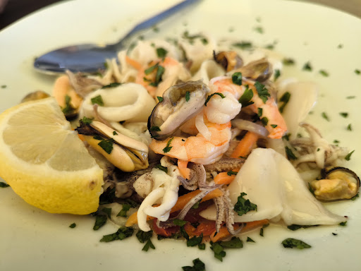 Worst food I have ever been served in a restaurant, hands down. I asked for the mixed fried fish, my husband ordered ‘strip of beef’. We ordered fries as a side. The fries arrived ten minutes before the mains. The ‘fried fish’ was not only cold but I swear to god it was solid rubber. And it’s was octopus, not a single piece of fish. The steak was freezing too. All sent back and a hasty pizza orders which was watery and bland. Try the little trattoria a few meters away, far superior...