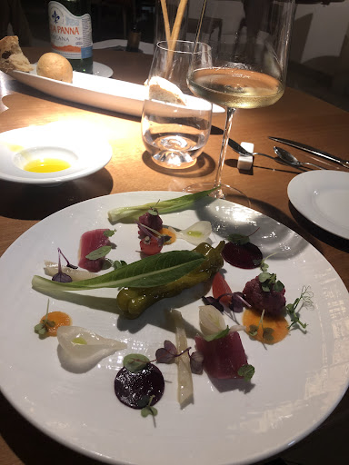 The biggest disappointment of our trip. We were not this hungry and hesitated between the 3 or 4 course meal rather than the tasting menu and went for 4. The welcome bits were nice. A promising start The single scallop was perfectly cooked The pasta with meat ragout was a stupid choice. Meat sauce was dry and fibrous. We had much better in restaurants focused on pasta for a fraction of the price. Portion was very small. Beef and Lamb was well cooked and all good, but there was nothing special about it. Just a good slice of meat. A small portion once again. It was definitely a bad choice. I could have cooked something equally good at home. The dessert "My sea I don't know you" was the most interesting part of the meal. A lemon custard with anchovy flavoured meringue on top. I won't say it was bad per se, and we both could understand the idea behind it, but unfortunately we didn't enjoy the strong fish flavour in our desert. We asked for 1 glass of wine each. We were offered some local wine. It was good but nothing exceptional. This was priced at 12 euros a glass. A little steep we thought. And at the end of this unsatisfying meal, and despite our small appetite, we were still hungry and stopped to have a gelato on our way home. Definitely bad value for money. This was about 120 euros per person and we had a much more pleasant meal the next day for 20 euros. The restaurant is well decorated, service is nice, but it feels a little sad with only 6 people coming on this evening...