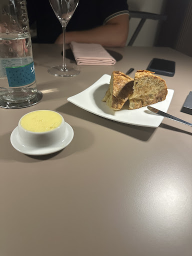 The service was impeccable, with the staff's professionalism shining through in every interaction. One of the many highlights was the innovative presentation of natural and frizzante water, each served in distinctively marked glasses. This thoughtful touch was followed by the arrival of warm wheat bread paired with homemade salted butter, a simple yet delightful introduction to the culinary creativity of Gimmi.