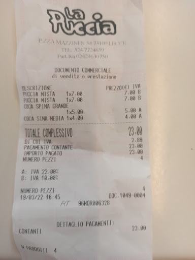 Read moreLa Puccia è sempre stato un gran bel punto di riferimento qui a Lecce ed è veramente un peccato riscoprirla in questo modo: i prezzi delle pucce sono lievitati fino ad arrivare a 8 euro (il listino dei prezzi non è stato neppure sostituito, tutti i prezzi sono stati semplicemente corretti con la penna). Gli ingredienti per la farcitura, una volta vari e sfiziosi, sono ormai limitati a poche verdure sott'olio, qualche oliva, mais, cipolle, lattuga, pomodori e pochi altri ingredienti ben diversi da ciò che eravamo abituati a trovare. Inoltre, il personale si è dimostrato poco cortese, come se non avesse ricevuto un'adeguata formazione su come rivolgersi alla clientela (l'abbiamo testato non solo sulla nostra pelle, ma abbiamo anche avuto modo di osservare varie dinamiche con altri clienti serviti prima e dopo di noi). Un vero peccato che un simbolo di Lecce come La Puccia, posto che ho sempre consigliato a chiunque visitasse la città, si sia ridotto ad un fast food costoso, inospitale e di scarsa qualità. Purtroppo non mi sento più di...