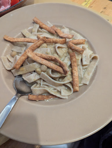As for my meal, I ordered the chickpea pasta, which was the only vegetarian option. It was by far the blandest meal I've ever had. To top it all off, when we received the bill, it included the missing items. The staff seemed confused when we mentioned not receiving the wine, even though there were no wine glasses or empty bottle at our table.