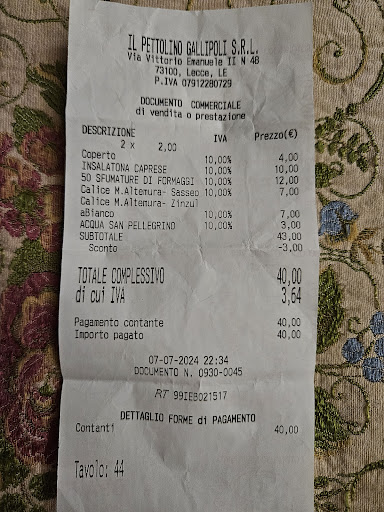 Despite this chaos, I decided to go through with my proposal. In hindsight, I regret not walking out immediately. We ordered a minimum amount of food, and our friends only ordered drinks (they were terrified to eat there). To make matters worse, the restaurant staff showed zero concern. They didn’t offer any apologies or, at first, even any discounts. Instead, they just smiled and dismissed the situation with a casual "things happen, it's Italy." As we were about to pay a bill, we asked if they would want to make things better with us, so they offered 3 Euro discount...(see the receipt), I was laughing at that point, but my fiance was not.
