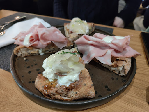 Read moreÈ la seconda volta che ceno, insieme ad alcuni amici, in questo locale. Particolarmente farraginosa la procedura per riservare un tavolo (prenotazione gestita esclusivamente tramite sitoweb/whatsapp/email, no contatto telefonico diretto, "stranamente" non disponibile per la fascia 20-21.30). Ambiente carino, ricercato, anche elegante per certi aspetti, in stile lounge-bar, essenziale e pulito, adatto a una clientela giovane più che alle cene di famiglia. Pochi tavoli, uno alto con sgabelli, abbastanza grande da dover essere condiviso - cosa non chiara all'atto della prenotazione - tra tavolate diverse (ma si sa : di sabato ci si deve stringere un po'). Si sta tuttavia abbastanza comodi, anche senza schienale. Servizio cordiale e personale simpatico e disponibile. Optiamo per le chips e un misto di montanarine (due per tipo delle tre varianti disponibili), due di noi desiderano provare la "crunch", io opto per una pizza classica (la Cattiva) e gli ultimi due optano per due spicchi a testa di altrettante "crunch". Da bere ci ai divide una bottiglia di Vertiga Bislakka, una discreta birra amber ale, integriamo con due birre rosse alla spina e due bottiglie d'acqua. Nulla da dire sulla qualità degli ingredienti, per carità. Tutto buono e gradito ai commensali. Pizze buone, equilibrate, buon impasto. Le crunch sono servite fredde, al massimo tiepide, ma eravamo stati avvisati. Nuove entrate nel menù UEMÈ, si sono rivelate delle scelte azzeccate. Nulla da eccepire, dunque, sulle materie prime utilizzate, né sul prezzo, da queste ampiamente giustificato (e per quanto 22-24 € per una pizza possano, a primo impatto, far storcere il naso a chi crede di mangiare la classica pizza). È doveroso però fare un appunto : facciamo notare alla gentile signorina che ci ha serviti, che le montanarine sono arrivate fredde. Non riceviamo un feedback alla lamentela e non insistiamo oltre. Attendiamo quasi 40 minuti, sollecitando più volte, una semplice birra alla spina. Il conto a fine cena arriva, però abbastanza celermente e altrettanto celermente viene saldato, senza ulteriore indugio e senza sfociare in polemica, nonostante trovi, ancora oggi, abbastanza ridicolo pagare 1 € (o 1,50 €, dipende) per due micro-ciotole di salsine, in accompagnamento alle chips, su un conto di quasi 160 € per aver mangiato meno di una pizza a testa e bevuto 3 birre. E, lo ripeto per chi legge, non sono uno che guarda al prezzo, non lo faccio se scelgo di fare un'esperienza di un certo livello. Ma al livello del prezzo deve corrispondere un livello di servizio, di gusto e di soddisfazione equivalente, altrimenti resterà solo la solita discreta esperienza del sabato sera, tra grandi aspettative deluse da piccole cadute di stile.