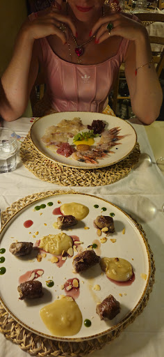 Staying in Lecce for four nights, we passed this restaurant several times on our strolls back to our apartment. The atmosphere is so lovely, that one friend said “we must eat here one night before we leave.” So that we did, on our last night. The atmosphere was matched by the wonderful service of our delightful waiter, as well as by the sophisticated menu and delicious food. We ordered the unusually named “raw shrimp cheesecake”, which had raw shrimp and cheese but fortunately did not resemble a cheesecake as it is known in the US in any other way. Instead it was a refreshing appetizer with chopped peaches, chopped raw shrimp and cheese. We also ordered a beef and buffala mozzarella appetizer, which was abundant and delicious: raw beef a la beef tartare. A guinea fowl special with potatoes and vegetables did not disappoint. My pasta with beef ragu was on the salty side, but my taste buds dulled by a recent cold, it did not overwhelm. Highly recommend having a leisurely meal at Vico deli Sotterranei. With a shared bottle of Prosecco for three, we spent €35 per person. Very good value for money, especially considering other restaurants in the historic center can be pricey with lesser attention to creative menus. Sit outside, watch people stroll by and delight...