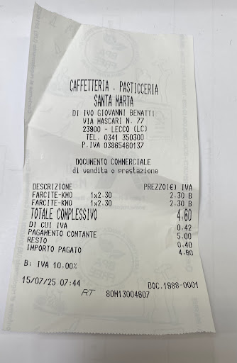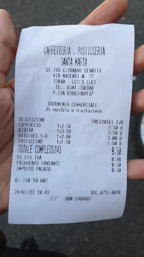 Read moreLa caffetteria Santa Marta è un locale storico finemente arredato con mobili d' epoca. Sembra di fare un salto indietro nel tempo, e anche se qualche tavolo andrebbe riverniciato a me piace esattamente così, con sedie ampie e comodi cuscini. Caffè di ottima selezione, cappuccino schiumato benissimo! Sottolineo la bontà dei loro dolci fra la celebre torta manzoniana e i caviadini e da non dimenticare la torta sacher, il tutto disponibile sia in tortine che comodi cubetti monoporzione da assaggiare col caffè. Non mancano le tradizioni, dalle zeppolline ai biscotti a forma di mela per San Nicolò e i vari dolci tipici lariani, insieme Ad altre proposte. Il mio posto di pace e relax, quando faccio shopping tappa fissa. Ps hanno anche deliziose crostatine alla marmellata senza lattosio, per celiaci non so e hanno i wafer Babbi e le...