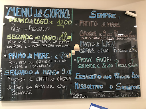 Pescheria che cucina piatti di pesce. Pochi tavoli, sia all'Interno che all'esterno. Sono andato due volte al sabato, sempre molto affollato. È possibile dover aspettare che si liberi un tavolo. Si ordina al banco, poi si prendono le posate, in acciaio, e il bicchiere in plastica e ci si siede al tavolo. Quando l'ordine è pronto, viene servito al tavolo. Offrono oltre ad alcuni antipasti, ogni giorno un primo di lago e uno di mare, un secondo di lago e uno di mare, e alcuni piatti come il fritto ci sono sempre. I piatti offerti sono sempre non banali, il pesce di ottima qualità, sia di lago che di mare, il tutto magnificamente cucinato. Servizio rapido ed attento, porzioni giuste, non abbondanti ma adeguate. Il vino al bicchiere viene servito in un calice di plastica, ma comunque di plastica rigida e buona qualità. I prezzi sono contenuti ed assolutamente adeguati. Solo il calice di vino è forse un po' caro data la quantità non particolarmente abbondante. Per i miei gusti è un'ottima scelta perché il servizio essenziale permette di offrire ad un prezzo contenuto una qualità veramente ottima, e comunque piatti anche sfiziosi. Tornerò certamente quando...