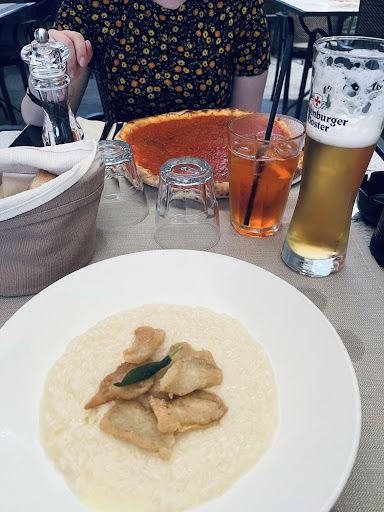 Read moreoverpriced. avarage dishes. definitely a tourist trap. worked for what we needed (vegetarian options, open on Tuesday, close to where we were staying), but I wouldn’t go back if the circumstances were different. the waiter was nice enough, but he recited exactly the same formulas to everybody else that didn’t speak italian. we got the food very quickly and had a table with a nice view of the piazza. marinara pizza I had was ok, but the sauce was very runny. no fresh herbs. think we over-paid because of different prices to the menu, or they charged a very expensive service charge (my boyfriend went in to pay, so i’m not 100% sure why). it was €47 for 1 pizza, 1 risotto, beer and...