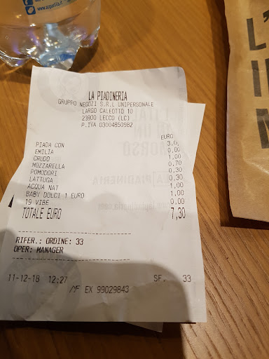 Read moreSiamo clienti abituali della catena “La Piadineria” … e in genere ci troviamo piuttosto bene. Anche in quest’occasione nel complesso non ci siamo trovati male, però quando prendi una piadina con i gamberetti, e alla fine i gamberetti non ci sono per niente… ci resti in po male diciamo. Ovviamente si tratta di una svista e questo non pregiudica il nostro generale giudizio positivo, però non è la prima volta che ci capita e quindi ci teniamo a far presente che un po’ più di attenzione aiuterebbe ad evitare che il cliente si allontani. Nel complesso rimane comunque un posto che frequentiamo volentieri. Personale cortese, ingredienti freschi, le piadine sono sempre buone e si...