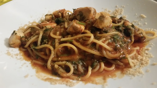 Eravamo Io e mia moglie ed entrambi abbiamo ordinato un antipasto di pesce, un primo piatto e un caffe Da bere abbiam preso una bottiglia d'acqua in 2 L'antipasto era una “insalata di polpo alla siciliana”, piatto servito tiepido che abbiamo apprezzato, soprattutto il polpo Il primo erano dei tagliolini alla siciliana serviti su un piatto grande, di bell'impatto ma ingannevole Si' perche' sembrano 2 tagliolini in croce invece la quantita' e' giusta in tutti i sensi, compreso il condimento La cottura era al dente e i pezzi di pesce erano integri e non disfatti, come spesso capita