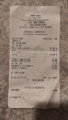 Le apparenze ingannano e in questo caso favorevolmente. Direzione Rescaldina decido di fermarmi da Yuan Sushi per un AYCE, consulto le recensioni e mi salta all'occhio una che "mette in guardia" sull'aspetto un po' decadente dell'esterno ma rassicura sui piatti e la cortesia dello staff, così decido di provare. Un po' defilato dalla strada principale ma facile da raggiungere, parcheggio lungo la via e così mi rendo conto che effettivamente l'esterno ha davvero bisogno di un restyling. Veranda esterna buia e dal forte odore di sigarette con qualche tavolino. Ingresso senza barriere architettoniche. Ci accoglie un sonoro e cordiale "ciao" da parte di una gentilissima signora asiatica che ci fa accomodare al tavolo, siamo in tre. Gli interni sono datati, sembra più una trattoria dal mobilio di una volta, corner del sushiman dietro il bancone "bar", poca luce interna. Tutto però è molto pulito e ordinato. Due ragazzi ci vengono a chiedere che formula preferiamo per il pranzo, menù fisso o AYCE Sushi. La cucina propone due versioni di menù, uno trattoria italiana e l'altro classico China-Jappo. Menu completi, foglietto volante per segnare i piatti richiesti, il locale inizia a riempirsi di clientela variegata in pausa pranzo, famiglie, coppie. Cibo buono, ben preparato, servizio tutto sommato anche nei gusti tempi. Conto due adulti (18€x2) e un bambino (12€), coperto (2€x2), acqua minerale frizzante (3€x2), totale 58€. Esperienza positiva, ambiente rustico lontano dalle classiche locations alle quali si è abituati in questo tipo di ristoranti ma nulla da invidiare per cucina e cortesia. Un suggerimento se posso ai due ragazzi in sala, il dress code è importante, lasciate la felpa col cappuccio nell'armadietto e indossate una bella camicia con un grembiule come le vostre colleghe. L'occhio vuole la sua parte e così dareste una maggiore impressione di pulito e ordine nel vostro modo di presentarvi. Lo consiglio senza dubbio, cortesia e buon...