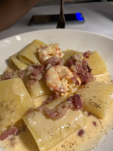 Ma la cosa che mi ha lasciato davvero perplesso è stato il primo di Paccheri con gamberi guanciale e credo crema di pecorino (foto) a parte la sapidità eccessiva del piatto , ma mi chiedo se a Masterchef hanno spiegato alla signora che in un piatto di paccheri vanno messi solo due (credetemi due davvero) gamberi nel condimento … Le famose proporzioni !?? Sarà stato Barberi che onestamente da l’impressione di essere un taccagno…😁 Voto definitivo alla cena 6- Alla fine per 4 menu completi con bevande a parte(1 vino da 20€) , anche l’acqua , abbiamo pagato 175€ , quindi neanche poco… Ripeto per simpatia. Miglioreranno ma c’è un po’ di confusione tra idea e...