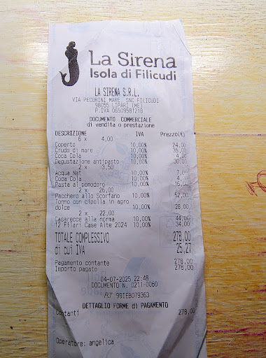 Read moreI see other visitors have pretty much slammed this establishment, which is both a café/restaurant, and a pensione. If you are in Pecorini, however, I'm not sure where else you could stay... You might have to go back to the main harbor of Filicudi.|| I had a somewhat different experience: we were staying with an Italian friend in the Aeolian Islands and breezed into La Sirena twice -- my hostess gave us a long disquisition on the owner (not sure if this has been the owner all along that some visitors had experience with), who is from the Italian mainland, has such and such businesses, and only comes to Filicudi for short periods -- no doubt in the summer. But all that is mostly irrelevant; we had snacks and sat outside on the terrace. It was pretty warm and the scene was quiet, dreamy. It seemed like there wasn't much that needed saying and our demands of the café were minimal. We loved the location and although we were in the islands in June, no one seemed to be around.|| Considered among the grand sweep of places to go in Italy, these islands seem special and isolated -- the last in a mostly good way. It is largely Italians to be seen in the majority of the locales, and they seem to want to keep it that way. The ferries are not guaranteed to get the island you are heading for -- and this is true even in the summer; so the transportation is hit or miss. Our hostess observed that in her last visit down here, in October, she was stuck on one island for three days. So keep your schedule flexible.|| I found the islands relaxing, regenerating. I could easily stay there for a month, writing or whatever -- but I may be a little strange.|| Stromboli (see my other review) is up the road and worth a hike if you can fit it in.|| ...