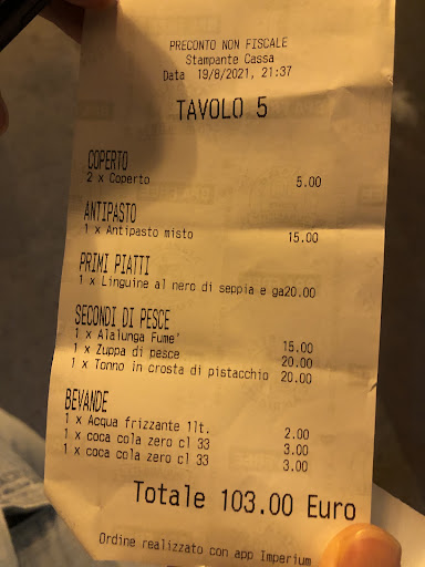 My boyfriend and I (who both grew up in Italy) started our meal with a “fresh” fish appetizer and a pasta with Gamberi di Mazara and squid. If I buy fish at the supermarket in Milan, I’ll get something that has super better taste. The pasta was almost cold, which led me thinking that was pre-cooked, maybe for another customer - this is sad cause the taste seemed nice. Then we got a fish similar to tuna and a fish soup. The fish had no taste, had no side and the sauce they paired was too sweet (see picture). The soup itself wasn’t bad but the fish and shellfish was chewy and, again, had no taste. The soup got served with no spoon, no plate for the shells, no bread.