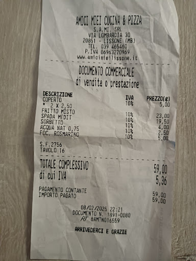 Read moreDi recente, io e mia moglie abbiamo avuto il piacere di cenare al "Ristorante Pizzeria Amici miei" a Lissone, e l'esperienza è stata davvero notevole. Il locale, che si presenta accogliente e curato, offre un'atmosfera ideale per gustare le specialità proposte. Come appassionati di pizza, abbiamo subito apprezzato la varietà del menù. Io ho optato per una "Sapore di Mare", mentre mia moglie ha scelto una "Mare e Monti". Entrambe le pizze si sono rivelate deliziose, con ingredienti freschi e ben combinati, e un impasto leggero e fragrante. È evidente la qualità della cucina italiana che questo ristorante promuove, con un occhio alla tradizione e un tocco di creatività. Un plauso speciale va al personale: ogni membro del team è stato eccezionalmente gentile, paziente e disponibile, rendendo la nostra serata ancora più piacevole. La loro attenzione al cliente e la professionalità sono un vero valore aggiunto. Amici miei non è solo pizza; il menù offre anche piatti di carne e pesce tipici della cucina tradizionale italiana, con la possibilità di scegliere tra diverse opzioni, inclusi i menù per la pausa pranzo. Inoltre, il ristorante è attento alle esigenze di tutti, offrendo tavoli all'aperto e servizi per persone con disabilità. Consiglio vivamente il "Ristorante Pizzeria Amici miei" a chiunque cerchi un'esperienza culinaria di qualità a Lissone, dove il buon cibo si sposa perfettamente con un servizio eccellente. Torneremo...