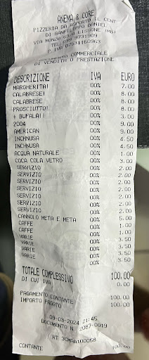 Decidiamo quindi di andarcene, lasciandogli i soldi, con la promessa di non ritornarci mai più. Tempo 2 minuti, esce la ragazza con le nostre pizze, scusandosi per l'accaduto. Le abbiamo prese perché ormai erano le 9 e 30 passate e avevamo fame, altrimenti gliele avremmo davvero lasciate per terra fuori dalla pizzeria!. un consiglio: delle volte l'empatia e l'educazione, fa rimanere il cliente più soddisfatto di una pizza ben fatta. D'ALTRONDE LA SUA MALEDUCAZIONE E' RISAPUTA, LEGGENDO ANCHE LE ALTRE RECENSIONI.