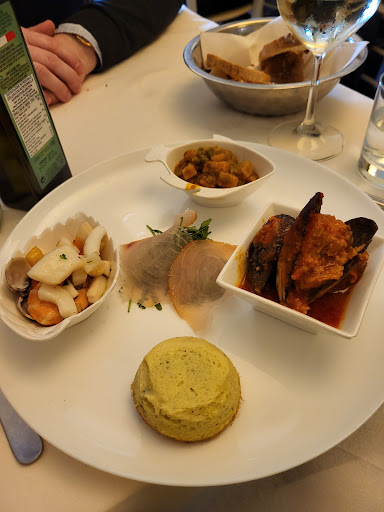 In Livorno you should eat seafood! We strolled away from the crowdy stalls and restaurants at pier-side and found another few locals on the main street near the government buildings area. The big one was full with more people waiting; so we checked in this one for a table for two and got it - after 15 mins it was full as well. The service was highly efficient; the drinks came at no time, and the food took maybe 10 mins. The taste is fundamentally good. We ordered a mixed seafood platte and a langostino pacchieri. The mixed seafood plate had swordfish carpaccio, cooked mussels, squird salad, and a small fish frittata. All of them were finely prepared and tasty. The paccheri was also very good - the shellfish was fresh and the sauce was the essence. It looks like a small portion but actually pretty stuffing. Staff are efficient but very friendly. The experience adds score to our good...