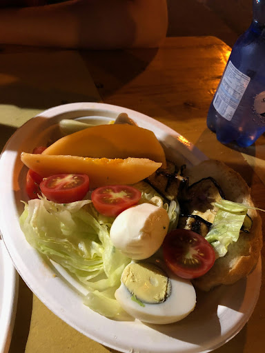 Abbiamo ordinato due taglieri, uno chiamato "Uovo sodo" e l'altro di salumi. Il tagliere vegetariano è quello in foto: meta uovo sodo (ne vedete il colore), qualche foglia di insalata buttata li, 3 pomodorini, due fettine di popone e qualche pezzettino di melanzana. A corredo, una fetta di pane, il tutto scondito e servito su un piatto di carta.