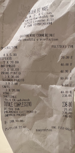 ⬇️ ABBIAMO PRESO: 1️⃣ 20,00€ Insalatina di Calamaro tiepido, pesche nettarine e misticanza 1️⃣ 20,00€ Sgombro sott’aceto con scampi, hummus di Valeriana, Maionese di Polpo e Cialda al sesamo. 1️⃣ 25,00€ Spaghetti alla chitarra, vongole sgusciate, Percebes della Galizia e Crema di Zucchine. 1️⃣ 25,00€ Carbonara di Mare: tagliolini bianchi con crema di carote, polvere di salmone e uovo marinato grattugiato. 2️⃣ 10,00€ Acqua Naturale (5,00€ cad.) 1️⃣ 9,00€ Tiramisù 1️⃣ 8,00€ Amaro del capo al peperoncino 🌶️ 2️⃣ 10,00€ coperti (5,00€ cad.) 💰 127,00€ TOTALI ✅ Consiglio per il locale: Servirebbe un elenco degli amari presenti, perché la voce “amari” sul menu è troppo riduttiva se sono presenti nella cantina una...