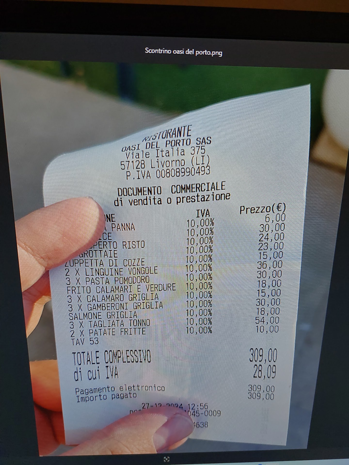 Il cibo non era neanche male, qualche problemino nel servizio ma niente di disastroso, poi è arrivato il conto (allego foto)... 309 euro per 5 adulti e 3 bambini. I bambini hanno mangiato solo tre MEZZE porzioni di pasta al pomodoro: 10 euro ciascuna, ed hanno portato spaghetti per bambini di 3/4 anni - abbiamo dovuto imboccarli naturalmente. Più il coperto, e vabbè. Restavano quindi 270 euro (cioè 309 - 30 di spaghetti e 9 di coperti) per 5 persone. Quindi 54 a testa! Contando che avevamo preso 1 piatto e mezzo a testa (alcuni li abbiamo divisi), 1 bottiglia di vino da 25 euro circa, un paio di secondi e niente dolci... Qualcosa non tornava, quindi iniziamo ad indagare (mai fatto di controllare uno scontrino, ma era palese che ci fosse qualcosa di assurdo). Così intanto scopriamo che avevano messo nel conto 5 calici (mai presi): siamo riusciti a farceli togliere (-30 euro). Ma il conto era ancora salatissimo, quindi continuiamo a indagare e scopriamo il fattaccio: la "grigliata mista" di mia moglie (alla richiesta del cameriere, aveva testualmente risposto "boh qualche calamaro e qualche scampo...") è stata fatta pagare OTTANTUNO euro. Infatti abbiamo chiesto chiarimenti vedendo tanti piatti (che non avevamo preso) nello scontrino. Ebbene, la grigliata è stata messa a scontrino come 4 piatti: 1 tagliata di tonno (18 euro) 1 salmone griglia (18 euro) 3 calamari griglia (15) 3 gamberoni griglia (30) Totale OTTANTUNO