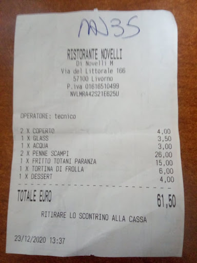 Read moreAssegno due stelle al Novelli, esclusivamente per la location vista mare e ben arredato,, per il resto assolutamente da dimenticare,,, Dopo prenotazione in zona gialla sono stato a pranzo il giorno 23/12/2020,,, e appena arrivato le cose si sono messe male,,, Ho fatto notare alla cameriera (l'unica senza mascherina ai tavoli,, ) che i tavoli erano troppo vicini compreso quello vicino al mio,,, al che, dopo averlo spostato di 10 cm. ha cominciato a inveire ad alta voce,, dicendo che erano nelle norme di distanza di 1mt, e 20 cm. Ma forse le sedute erano a quella distanza ma fra tavolo e tavolo non c'erano piu' di 40 cm. Ma la cosa più brutta e che sarebbe stato di alzarsi e andarsene subito,,, è che mi ha detto ad alta voce che se avevo paura del Covid, me ne dovevo stare a casa,,, Per rispetto ai miei commensali e per non fare casino,,, sono rimasto,,,, e arriviamo alle pietanze,,,,, Il primo, due penne agli scampi, li avrei cucinati molto meglio io,,, pasta cruda affogata in una salsina tipo pommorala con tre mezzi scampi sopra, senza sapore e insipidi,, non sapevano di niente,,, Il secondo, una sola frittura totani e gamberi in due ,di cui solo i gamberetti si salvavano,, ma o mangiare un totano o una soletta di scarpa erano uguali,,,, si sentiva solo il sapore della pastella e basta,,, meta' lo abbiamo lasciato li,,, Il dolce,,, due tortini di crema pasticcera certamente comprato al Penny,,,, da vergogna ,, nessun sapore,,, solo la fragola era buona,, Ho chiesto del vino, e mi è stato proposto o la bottiglia o un calice,,, ho scelto il calice che mi e' stato portato al tavolo gia' versato senza sapere che cavolo di vino sia stato,,, La spesa finale € 61, 50 Per me possono rimanere chiusi a vita,,, non mi vedranno...