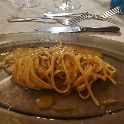Read moreLocale ottimo! Servizio super gentile! Il signore che ci ha servito ci ha lasciato l'intera bottiglia di vermentino con il cestello del ghiaccio pur avendogli chiesto solo due calici, dicendo che non voleva versare l'intero calice subito per non far scaldare il vino, attenzione per il cliente a livelli top! In tre abbiamo provato i tagliolini all'astice (con mezzo astice di fianco), spaghetti allo scoglio e linguine con il riccio di mare fresco. Come secondo ci siamo divisi un Cacciucco veramente abbondante e gustossisimo. Anche qui, su consiglio del signore che ha preso la comanda, non abbiamo ordinato altro in quanto ci ha detto che il Cacciucco é abbondante, veramente onesto! Le porzioni dei primi sono giuste, e come qualita non c'é niente da dire, eccezionali. Ci ritornero sicuramente quando ritorno a Livorno e la prossima volta provero il gran crudo che sembrava bellissimo a vederlo sugli altri tavoli. Per i 3 primi, un cacciucco, 2 dolci, 5 bottiglie di acqua, 2 calici di bianco e 1 caffé abbiamo pagato 100€! Veramente complimenti! A presto!