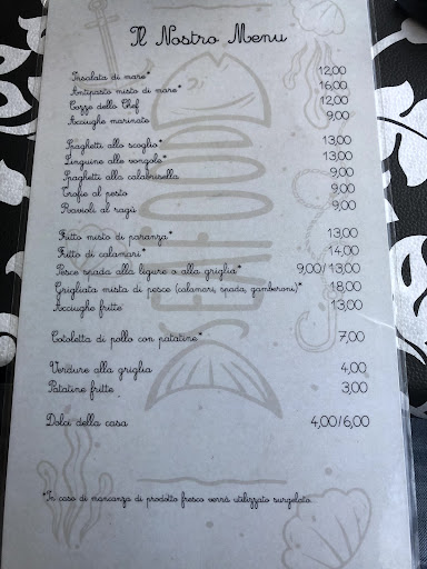 Read moreMai più Sto soggiornando a Loano e volevo provare questo ristorante, così ho ordinato d'asporto le linguine allo scoglio, gli spaghetti allo scoglio, le trofie al pesto, due fritti misti e patatine. In conclusione ho pagato 80€, (perché i prezzi sono diversi da quelli sul sito internet, ovviamente), la pasta che annegava in un mix di acqua e olio escluse le trofie che erano crude, il fritto molliccio, insipido e freddo come le patate (PS il ristorante era a due minuti da dove alloggio).Sconsiglio, ho buttato via quasi tutto. Darei zero stelle ma non si può.
