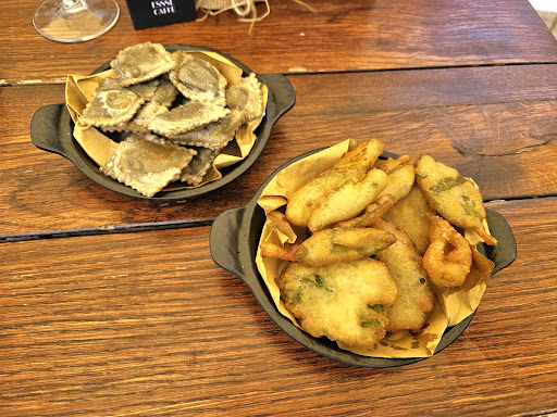 I was only here for a short stay but I quite enjoyed their finger food - fried ravioli with squid ink, and seasonable vegetable tempura fritters... all quite reasonably priced (8 euros or less), and a super tall glass of their house Locorotondo wine, which, be warned, is about 14%. Good wifi as well. The day I went, the sun was really beaming down, so I noticed many patrons shifting seats to try to get some shade; they didnt have umbrellas set up, so people will wait to get a table with more shade. Normal. Service was nice, and the staff were friendly and...