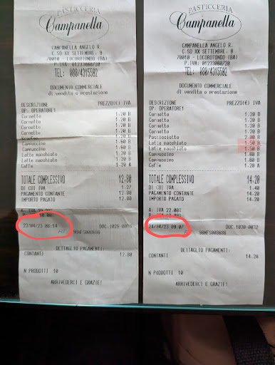 Buona le varianti offerte dei cornetti, anche integrali, ma praticamente contati. In due mattine avremo visto un totale di 20 cornetti e considerando che si parla di una Pasticceria con lavoratorio proprio... I krapfen, il cui gusto è dominato dall'olio fritto sono poco piacevoli da gustare. Discreto il caffè ma ottima la preparazione del cappuccino. Locale un po' retrò ma ben tenuto. Servizio in libero arbitrio. Nel caso nostro sarebbe stato meglio aspettare la titolare in quanto la seconda mattina, con le sole commesse, il conto, come rilevabile in immagine, ha avuto esiti diversi: il secondo giorno il latte e' costato di piu'. Quando fatto notare alle impiegate (senza ovviamente mostrare lo scontrino del giorno prima perche' sarebbe stato troppo facile) si sono mostrate in "apparente" reciproco imbarazzo e senza mostrare alcun cenno di ravvedimento; e al mio primo accenno di rinucia alla questione non hanno esitato a confermare l'importo richiesto. Quest'ultima e' la ragione dell'inserimento del piccolo accaduto nella recensione. A mio avviso sono cose che, al di la' dell'importo magari poco sognificativo, non dovrebbero mai accadere (per principio e non per valore). Ecco perche' il listino dovrebbe sempre...