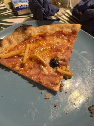 Allego foto della pizza con un oliva dentro la pizza alle patatine e prosciutto, l’ospite speciale non richiesto