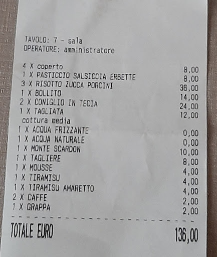 Dispiace recensire negativamente ma la cortesia del personale, non basta per farne un locale da consigliare. 4 persone: 1 antipasto, 4 primi, 4 secondi, 3 dolci. Risotto sbagliato in pieno per la cottura e la qualità dei funghi "porcini??" dal sapore acidulo. Porzione misera di circa 50/60 gr. Pasticcio inqualificabile, sembrava la monoporzione di Bofrost, non solo per il gusto ma anche per la ciotolina di portata. La tagliata è stata avanzata sul piatto. Il bollito era imbarazzante e l'unica cosa che spiccava era la coscia della gallina. Il coniglio, 2 minuscoli pezzetti quasi tutto osso che poteva essere anche capriolo al gusto, visto che era ricoperto da un improbabile misto funghi. Ottima la polenta. Dolci accettabili. Il servizio è puntuale e molto attento, anche se non professionale, ti fanno sentire bene. Il locale al primo piano con lunga scala, è poco invitante per l'arredo (tendaggi provvisori spero..) ma molto pulito e luminoso. Peccato le mosche molto presenti e fastidiose. Il conto,136 euro totale, 34 euro a testa non è sicuramente costoso ma molto caro, carissimo per quanto abbiamo ricevuto. Purtroppo bocciato. P.S. io e mia moglie, a casa, abbiamo dovuto compensare la fame con pane e Nutella...😅😅😅