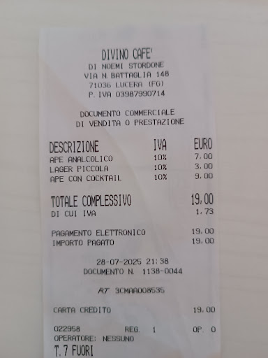 Read moreSe vuoi un pranzo di qualità, veloce e abbondante il DiVino Cafè & Food e’ il numero 1 a Lucera, ottimo ambiente, servizio eccellente, ma il vero motore delle cucina è la Chef Lina 👩🍳 che sforna dei piatti da paura, ogni giorno delle pietanze diverse e di gran qualità, diciamo che per me merita una stella ⭐️ Michelin, dopo se si è fortunati in cucina, a volte, c’è la Sig.ra Loreta la mamma di Noemi, eccellente Chef 👩🍳 da provare anche le sue squisite pietanze. Complimenti a tutto la staff e a Noemi la proprietaria che ti accoglie sempre con un bellissimo...