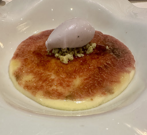 Read moreThis is a fabulous restaurant with fabulous food and fabulous servers that are hovering to help you. It’s got white tablecloths and white napkins and beautiful silverware and beautiful view overlooking the Mediterranean right at the top of the hill. It’s also a glorious place to walk around both during the day and night. The food is delicious and I had a dessert that was absolutely incredible. I could eat five of them, although it was a great big dessert with in the center, it had a lemon yogurt foam with little dots of some sort of jam And little bits of sugared almonds, and then around it fresh fruit, and some raspberry sorbet and various smears of coulis. I had a pasta dish that had a very unusual shaped spaghetti. It’s called Tagliolini. It’s kind of a square cut spaghetti. It had tomato sauce on it made of three different kinds of tomatoes, and it was just perfect. I think I’m going to extend my stay in the hotel down the street just so I can come here a couple more times and sample some of their other selections because it’s a wonderful selection of food. I don’t eat much so I just had the spaghetti but people who eat much would just have that as one course. I had a liter bottle of water of sparkling water and I had the pasta dish and the wonderful dessert and it’s in a $30 range and...