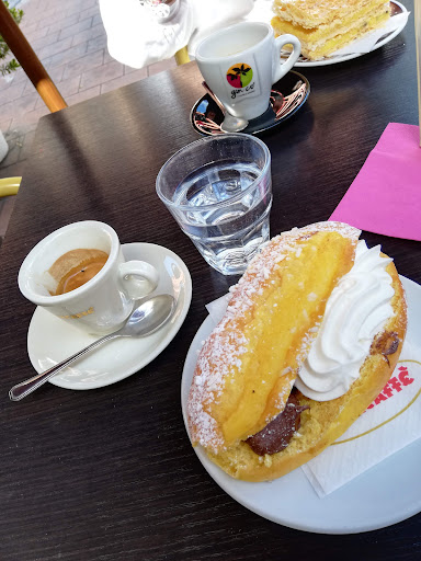 We went into this patisserie and bar, intending only to get a cappuccino, but were enticed by the amazing aromas into sharing a cake too. It was worth the calories! The coffee was served just as I like it; at my request it was really hot, sprinkled with cocoa and the Romcaffe blend was tasty without being bitter. As for the environment, there was plenty of comfortable seating, both on small tables and larger ones with banquettes. The room at the rear has beautiful views across the valley, too. On the negative side, the high demand for service didn't allow time for wiping tables between clients and the music was a little loud for our taste. All considered, we'll be going...