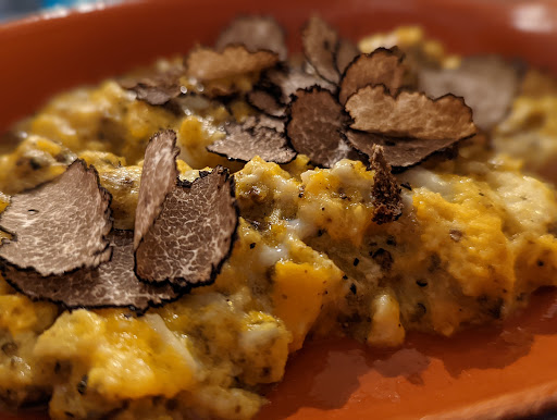 La principale nota dolente sono stati i piatti. Mossi dalla voglia di provare il tartufo, abbiamo preso alcuni piatti nella loro variante "tartufata" (con sovrapprezzo medio di circa 5€, onesto parlando di tartufo nero). Il problema è stato che nei primi il tartufo era completamente inodore e insapore, e il piatto pur restando buono di base è venuto a costare di più per nulla. Nei secondi la cosa è migliorata (hanno usato un altro tartufo), ma comunque estremamente leggero. Sarebbe bastato usare un po' di olio al tartufo nel piatto per ingannare il palato e dare un senso al piatto. Tartufo a parte, il secondo di spezzatino di cinghiale al sottobosco era pensato male, con castagne intere e funghi giganti che risultavano poco piacevoli da mangiare e si amalgamavano poco nel sapore complessivo.