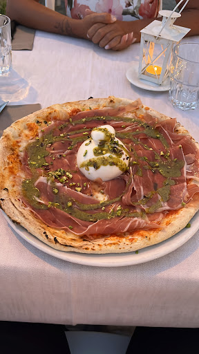 Abbiamo iniziato con una chicca che mi ha preso subito all’occhio. La pizza 🍕 “La pistacchio”, inutile spiegarvi cosa non ho sentito al sapore quando ho avuto modo di adddentare il primo morso. ❤️💯 Una burrata di quelle dimensioni, ma sopratutto così fresca pazzesca. Accompagnata con un letto di prosciutto crudo 🥓 e granelle di pistacchio e una salsa di basilico suppongo.