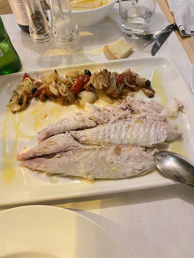Bene al mio arrivo, alle ventuno, all'interno del ristorante c'erano esattamente tre tavoli con un totale di nove persone, dopo dieci minuti d'attesa confermiamo la nostra ordinazione al cameriere, antipasto molto veloce... un crudo e del semplice polipo, da bere acqua e del vino bianco a seguire quattro primi per poi andare al secondo con il pescato del giorno "orata con patate al forno" ed un fritto.